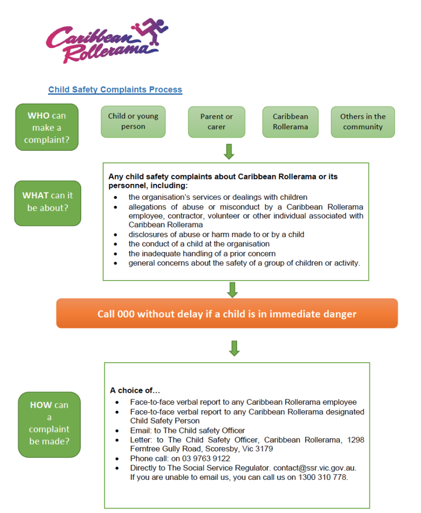 Caribbean Rollerama will keep information about child safety concerns and complaints confidential, except where it is necessary to share information to respond properly to a complaint or to prioritise child safety. Caribbean Rollerama will not disclose an individual’s personal information to any external party without their consent unless Caribbean Rollerama is required or authorised to do so by law. The law requires or allows, in certain circumstances, some organisations to share confidential or sensitive information about a person with each other, often to support safety or wellbeing. Caribbean Rollerama may therefore share relevant information about child safety concerns and complaints in accordance with its information sharing obligations (including those within the Child Information Sharing Scheme and the Family Violence Information Sharing Scheme), to promote the safety and wellbeing of children, where it is appropriate and in their best interests.